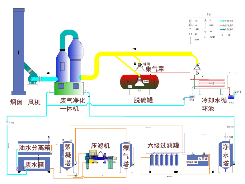 Thewaste gas is collected through vent hood, and goes into the main line. Then thegas goes through the alkali solution, where SO2, H2S,thiols, etc. are absorbed. After this, the gas goes into catalyze-oxidize unit,where the residue organic compounds and other odors are oxidized anddecomposed. Finally, clean gas is discharged.