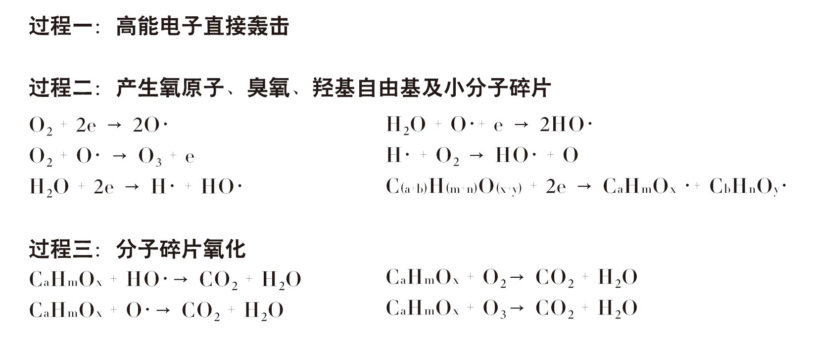 (2) 高能电子+分子(或原子)→(受激原子、受激基团、游离基团)活性基团