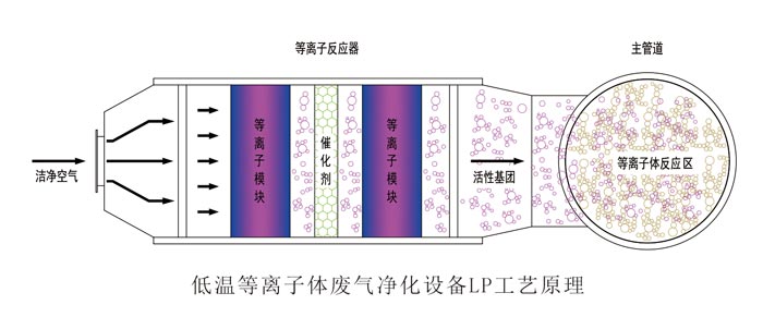 低温等离子体废气净化原理如下:在外加电场的作用下,介质放电产生的大量携能电子轰击污染物分子,使其电离、解离和激发,然后便引发了一系列复杂的物理、化学反应,使复杂大分子污染物转变为简单小分子安全物质,或使有毒有害物质转变成无毒无害或低毒低害的物质,从而使污染物得以降解去除。因其电离后产生的电子平均能量在10ev,适当控制反应条件可以实现一般情况下难以实现或速度很慢的化学反应变得十分快速。